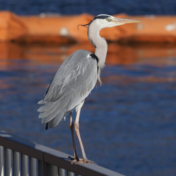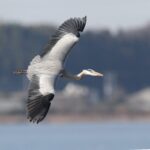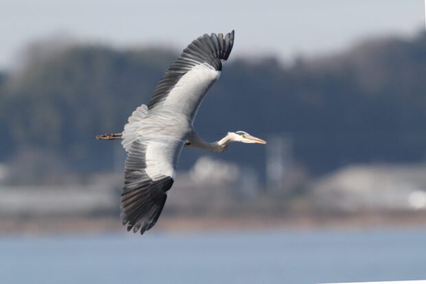 背中が灰色のもっとも大きなサギ。 首と足が長く、 とがったくちばしで魚などをとります。 長い首をS字状に曲げ、 大きなつばさをゆっくりはばたかせて飛び、 「グワッ」と大きな声で鳴きます。