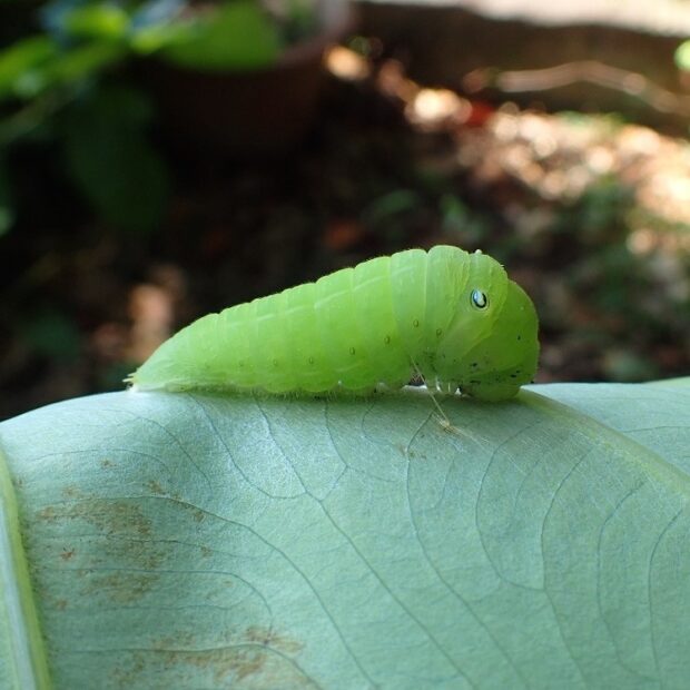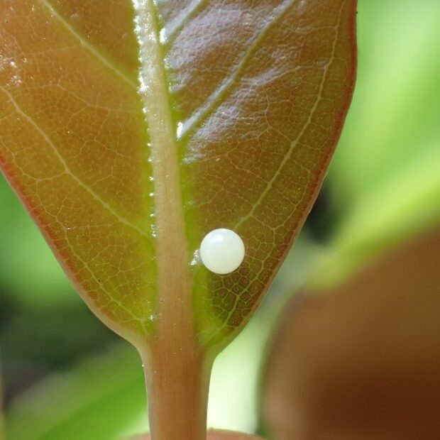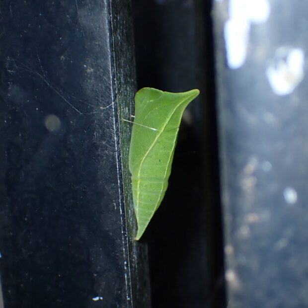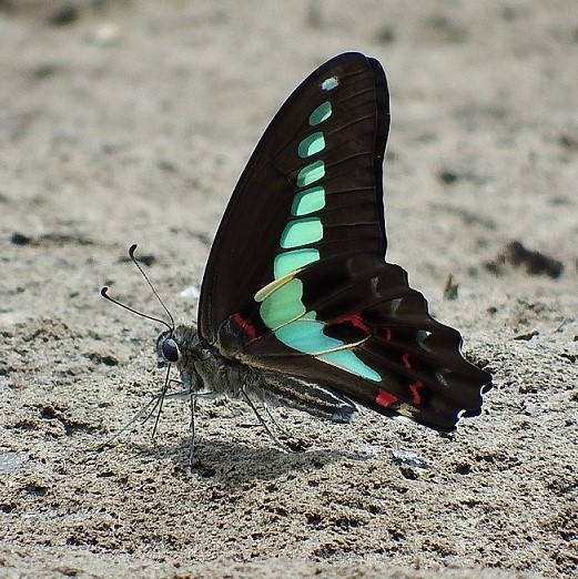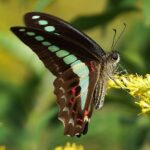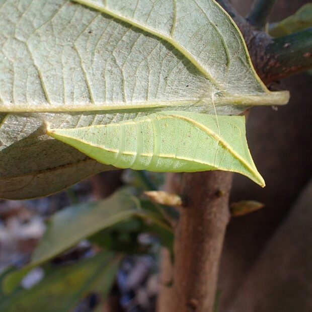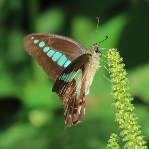 はねは黒っぽく、 青緑色のパステルカラーの帯がきれいな南方系のアゲハチョウ。 木や花のまわりを目まぐるしく飛びまわります。 都市部でも見られ、 公園や街路樹のクスノキにもやってきます。