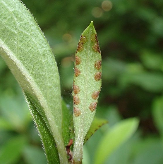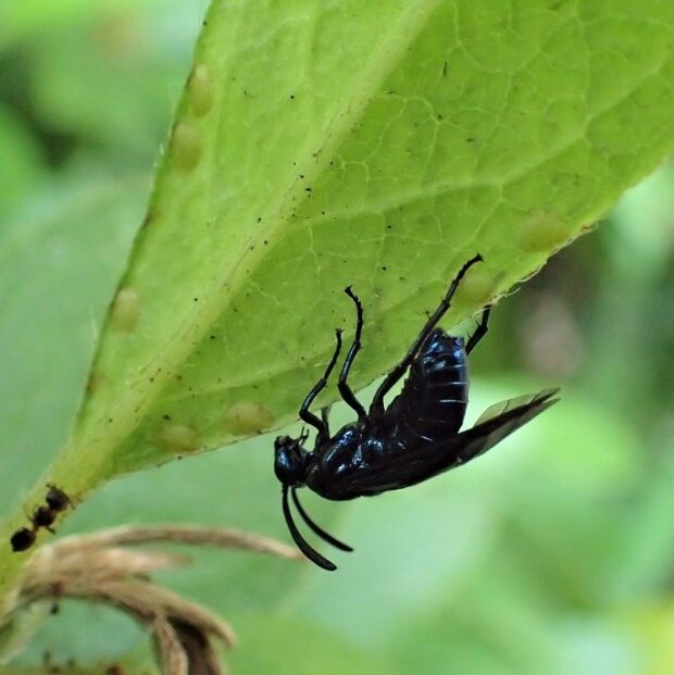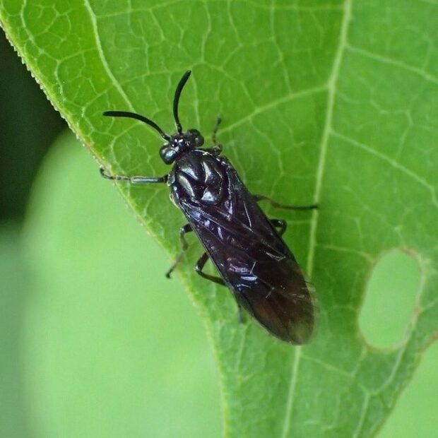 ツツジで見られる、 るり色の小さなハバチ。 メスは産卵管を葉のふちにさしこみ、 ツツジの葉の中に1個ずつ卵を産みます。 卵を産んだあとが、 茶色くなり目立ちます。 幼虫は葉を食べて育ちます。