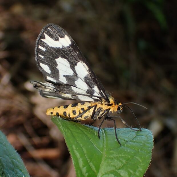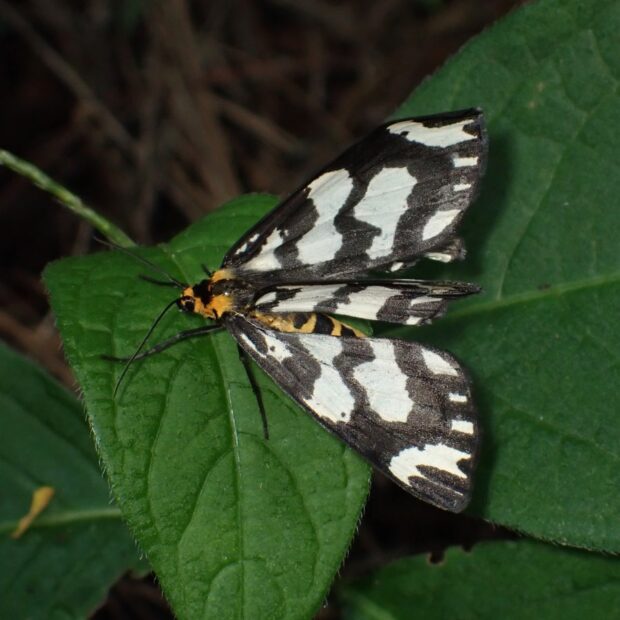 初夏、 昼間にヒラヒラ飛ぶ白黒のガ