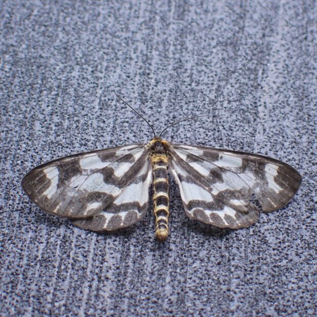 公園や庭など街中でも見られるエダシャクの仲間。 はねが黒と白のまだら模様で、 お腹は黄色と黒のシマシマ。 幼虫は黒地にオレンジ色の模様があるシャクトリムシで毒はありません。