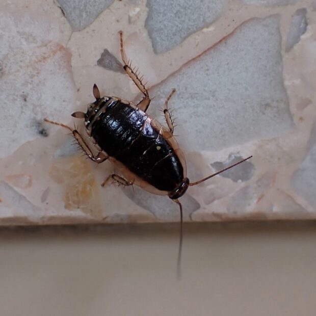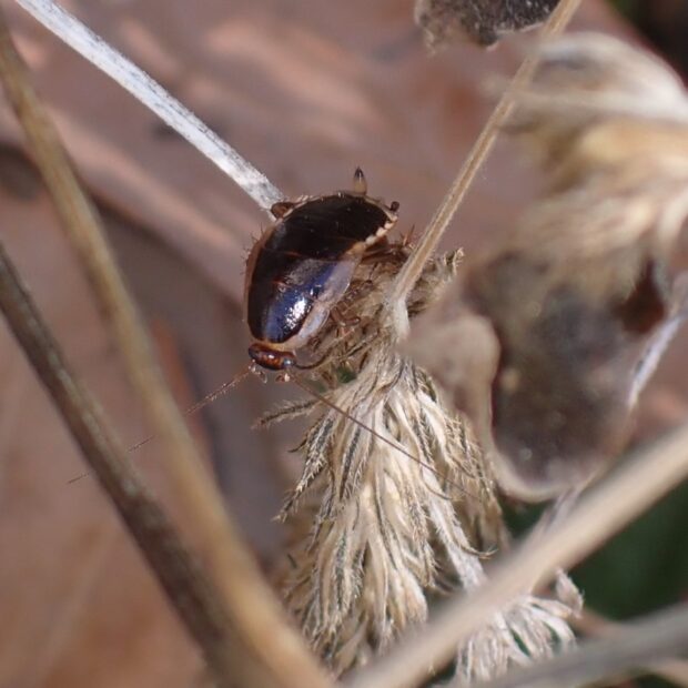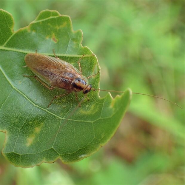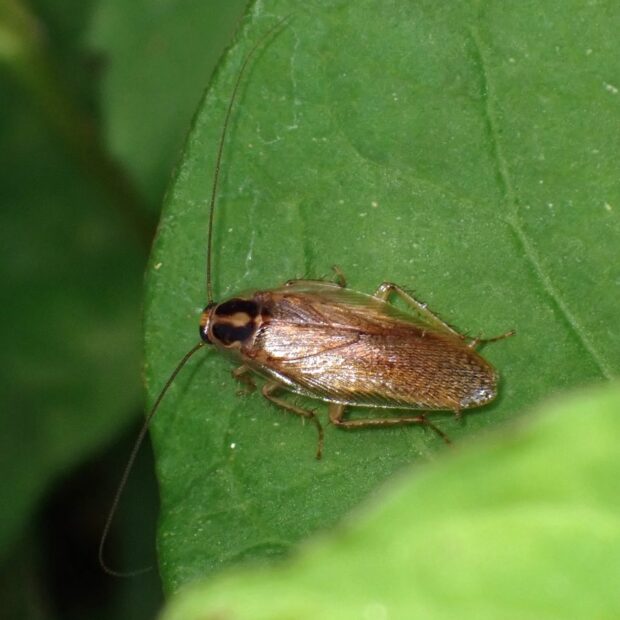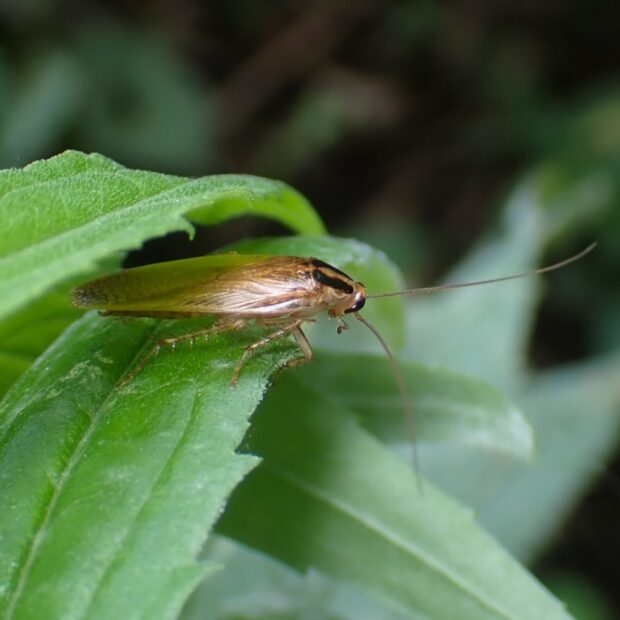 森や草地にすむゴキブリで、 家の中には入りません。 胸に2本の黒色の太い筋があり、 腹部に近いところで左右が接近します。 落ち葉や生き物の死骸を食べて、 土に返す大切な役割をもっています。 幼虫で冬を越します。