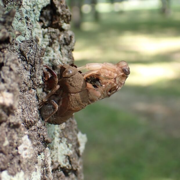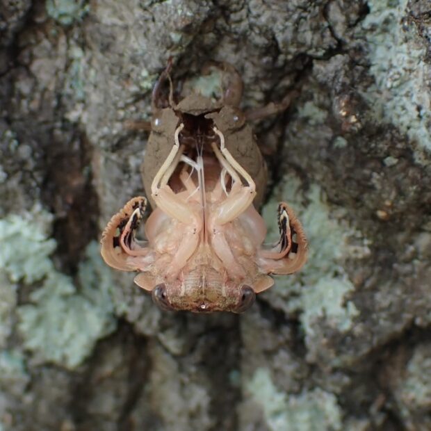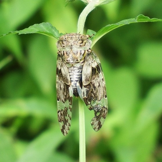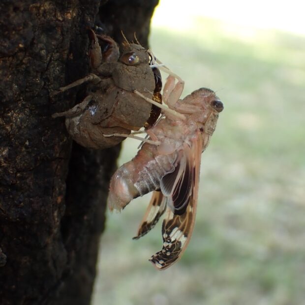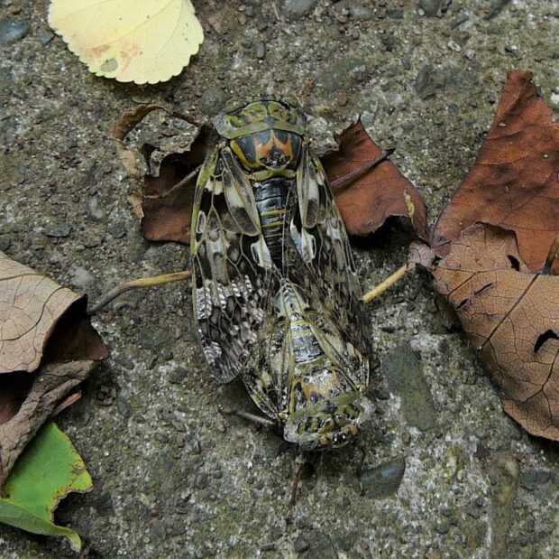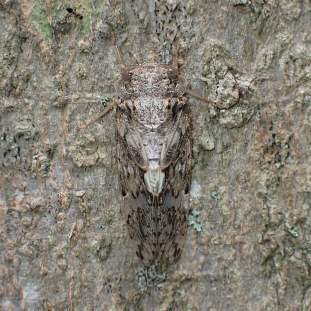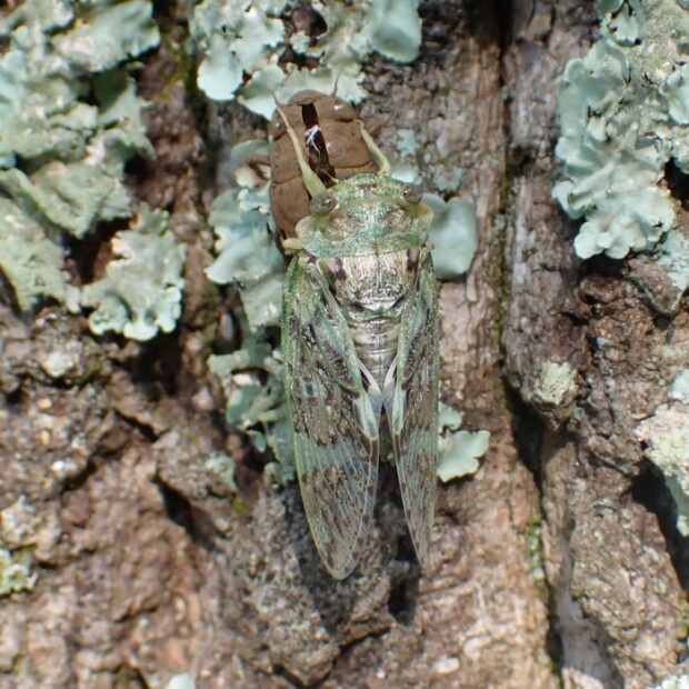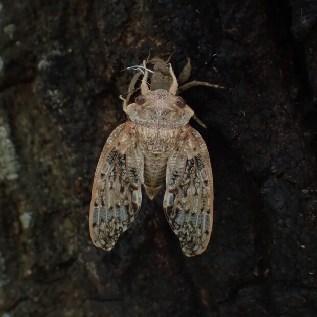 6月下旬ころから「チー・・・ジー・・・♪」と、 早朝から夕方薄暗くなるまで鳴き、 夏の訪れを知らせてくれます。 前ばねは複雑なまだら模様をしており、 木の幹にとけこみ目立ちません。 後ばねは黒地でふちは透明です。