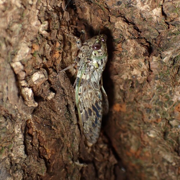 6月下旬ころから「チー・・・ジー・・・♪」と、 早朝から夕方薄暗くなるまで鳴き、 夏の訪れを知らせてくれます。 前ばねは複雑なまだら模様をしており、 木の幹にとけこみ目立ちません。 後ばねは黒地でふちは透明です。