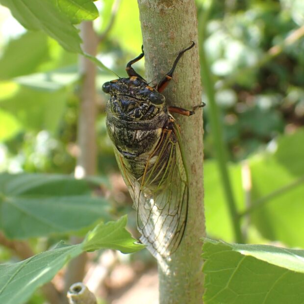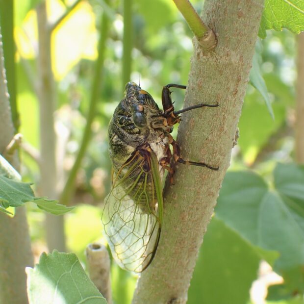 午前中に「シャアシャア・・・♪」と、 大きな声で鳴くセミ。 大型で黒くがっしりしています。 透きとおったはねには緑色の脈が目立ちます。 南方系のセミですが、 関東で増えてきており、 分布を東北地方まで広げています。