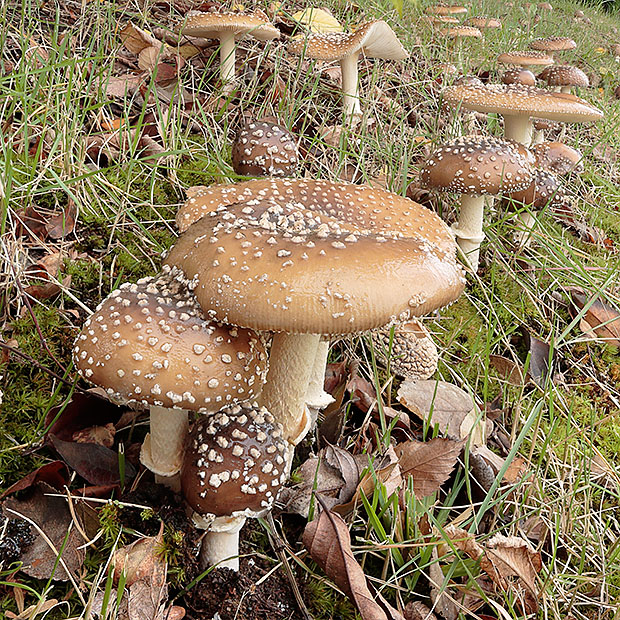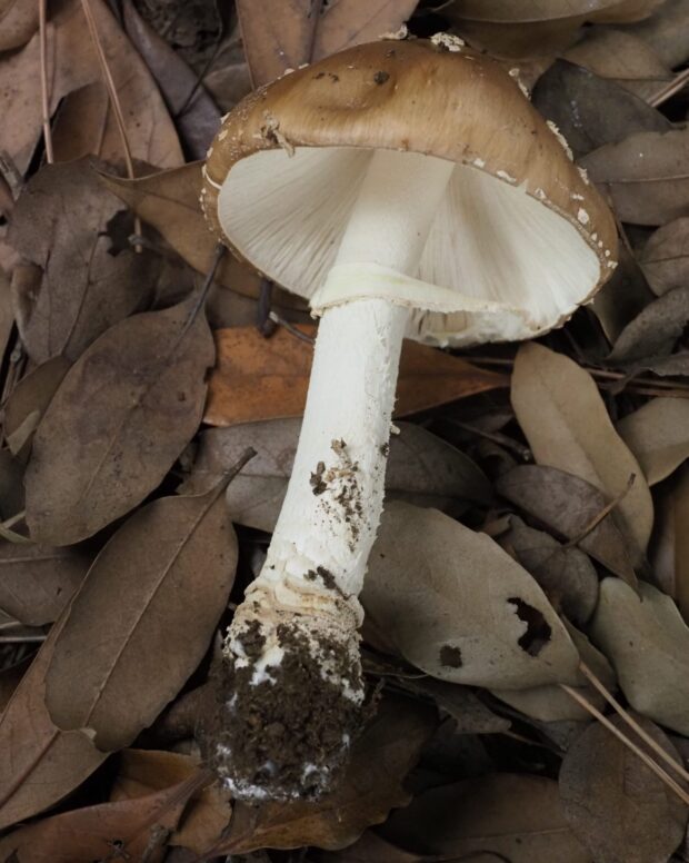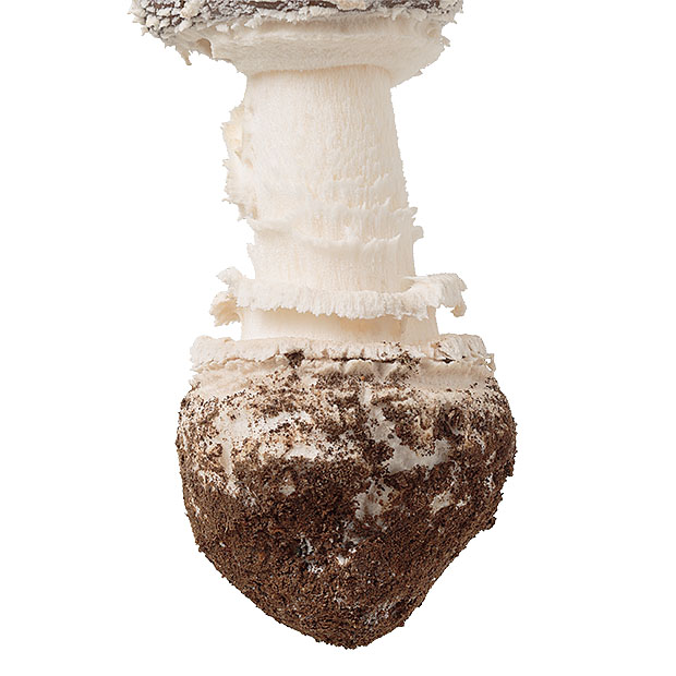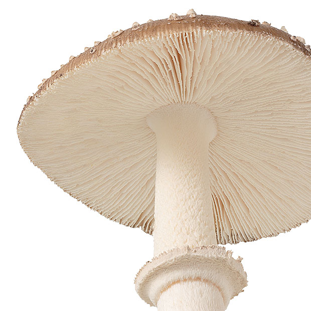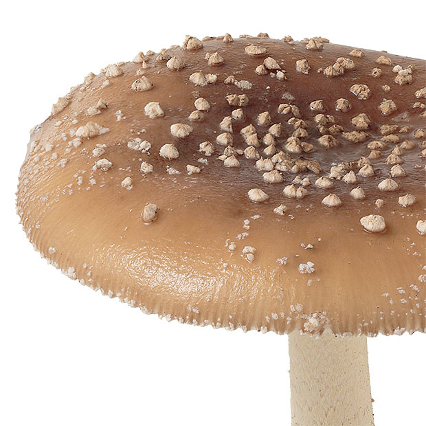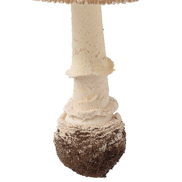 傘の表面が茶色。 その上に白っぽいイボが多数残る。 ツバ(柄の途中についている輪状のもの)はあるが落ちやすい。 ツボ(柄の根元を覆っているような部分)は、 複数のリング状になっている。