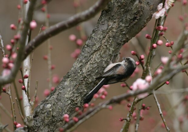 小さくて丸くてフワフワ!長い尾が特徴。 枝から枝へ忙しく飛びまわり、 小さなくちばしで昆虫やクモ、 木の実などを食べます。 鳴き声は、 「チー」「ジュリリ」。 冬は他の種類の小鳥と小さな群れになります。