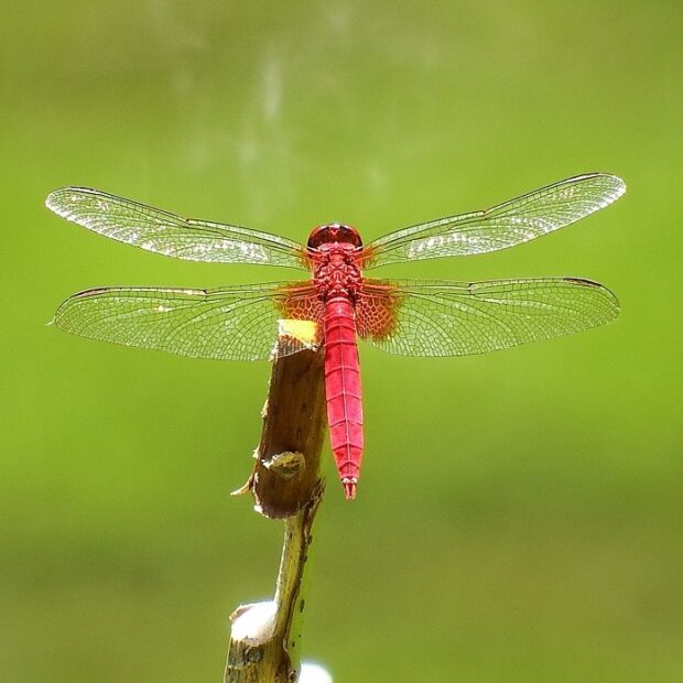 ショウジョウトンボは胸に黒い線がありません。 あしはオレンジ色~赤。