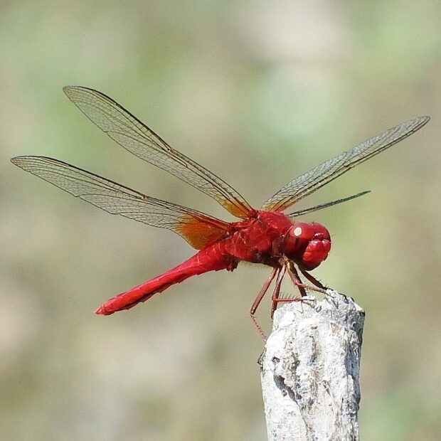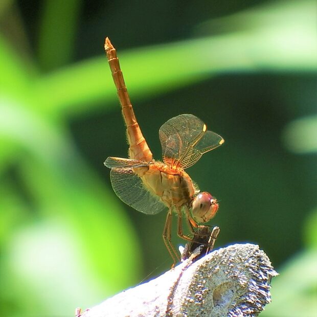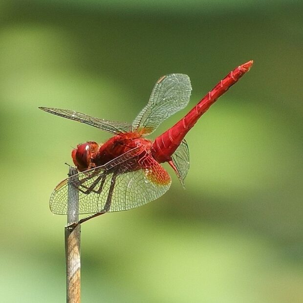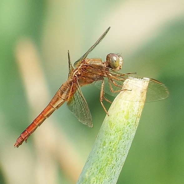 日当たりがいい水草がある池や湿地、 街中の富栄養化した池にもすむトンボ科の仲間。 オスは猩々(しょうじょう=架空の動物)のように全身がまっ赤、 メスは赤くならず黄色っぽい色をしています。 メスは水草に産卵します。