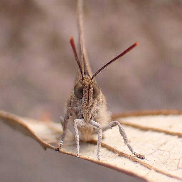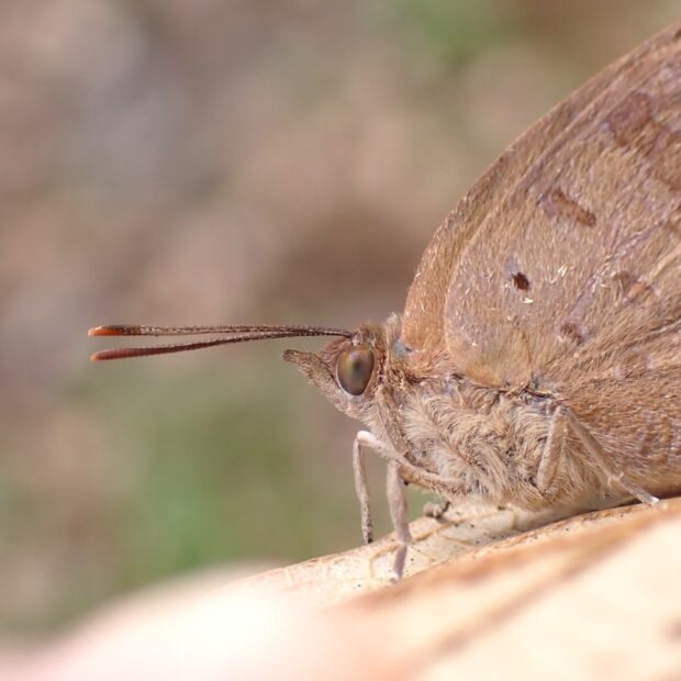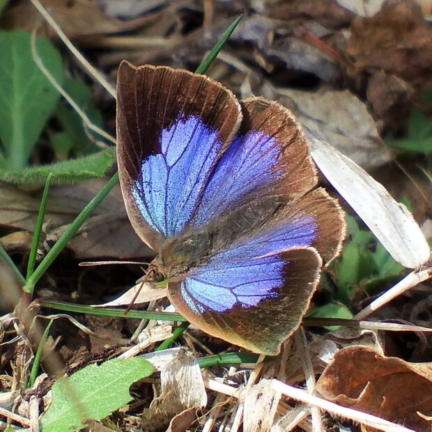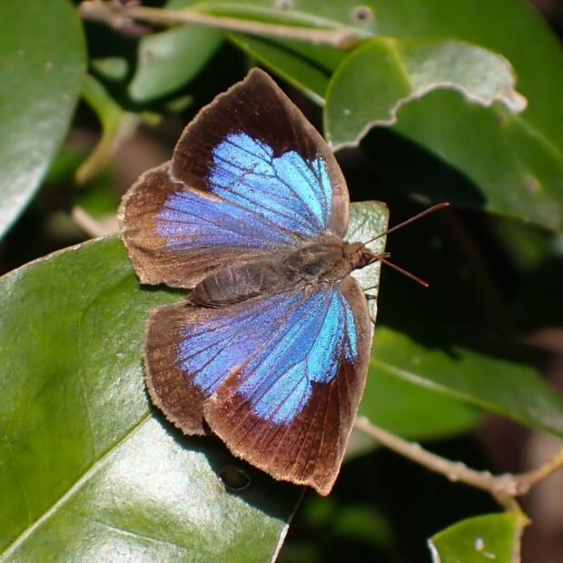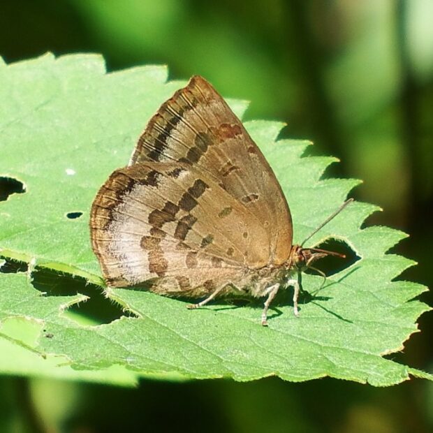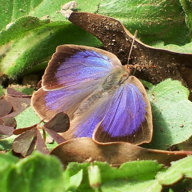 はねを広げると青紫色に輝くシジミチョウ。 はねをたたむと茶色で目立ちません。 幼虫はシイ、 カシ類やコナラなどの葉を食べて育ちます。 幼虫は体から栄養豊富な蜜を出して、 用心棒としてアリを引き連れています。
