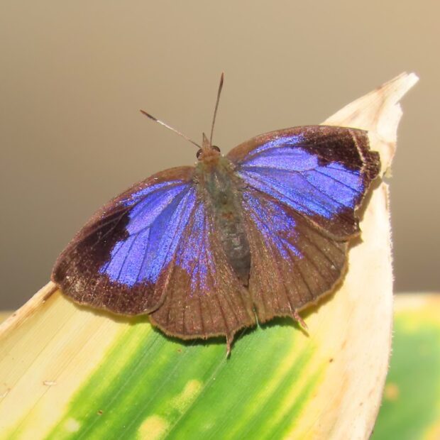 青紫色に輝く美しいシジミチョウ。 はねをたたむと茶色で目立ちません。 幼虫はマテバシイの葉を食べ、 蜜を出してアリに与えます。 南方系のチョウで、 1990年代後半から関東地方で見られるようになり、 分布を広げています。