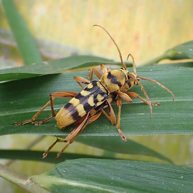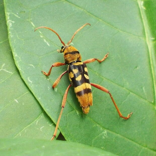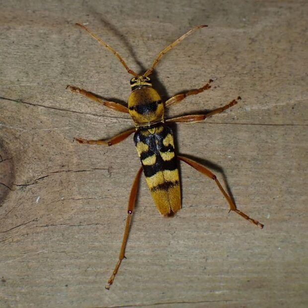 暖かい地域に住むカミキリムシ。 市街地の公園でも見られます。 黄色い体に黒い模様、 触角もそれほど長くなく、 アシナガバチのよう!?いろいろな花を訪れ、 広葉樹の枯れた木に集まります。