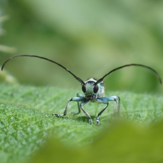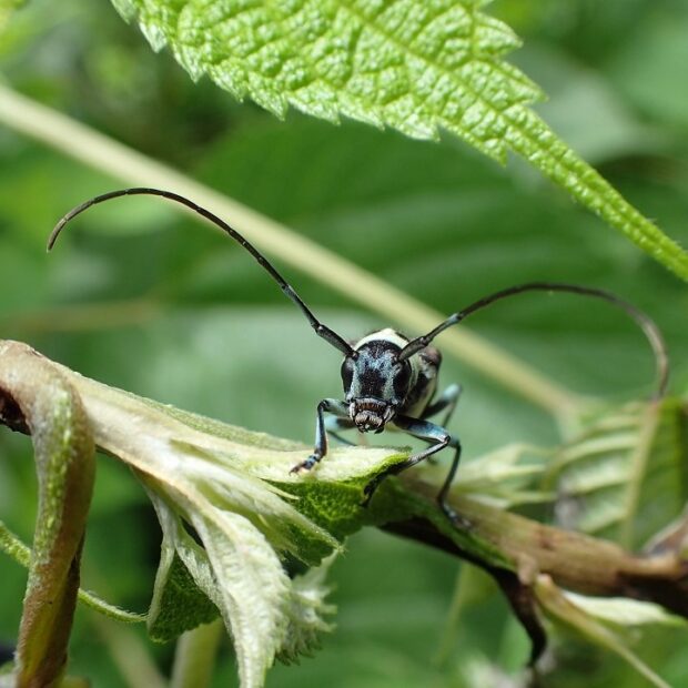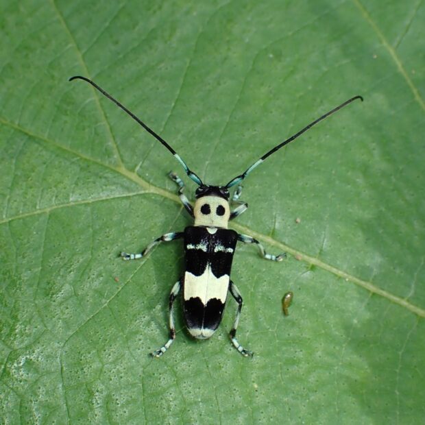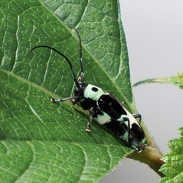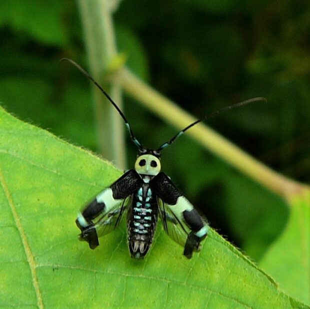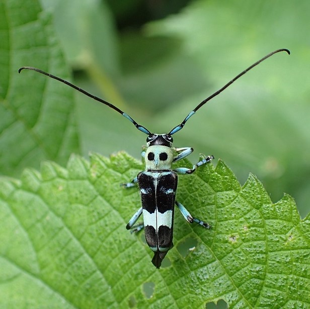 水色~黄緑色のきれいな色をしたカミキリムシ。 平地~山地に生息し、 カラムシ、 ムクゲなどで普通に見られます。 ラミーとはカラムシという草の仲間で、 繊維(布などの材料)をとるために輸入したもの。 ラミーカミキリはその草について来た中国からの外来種だと考えられています。