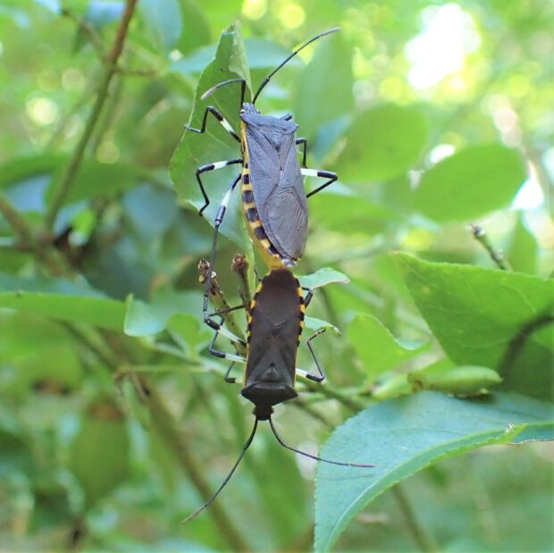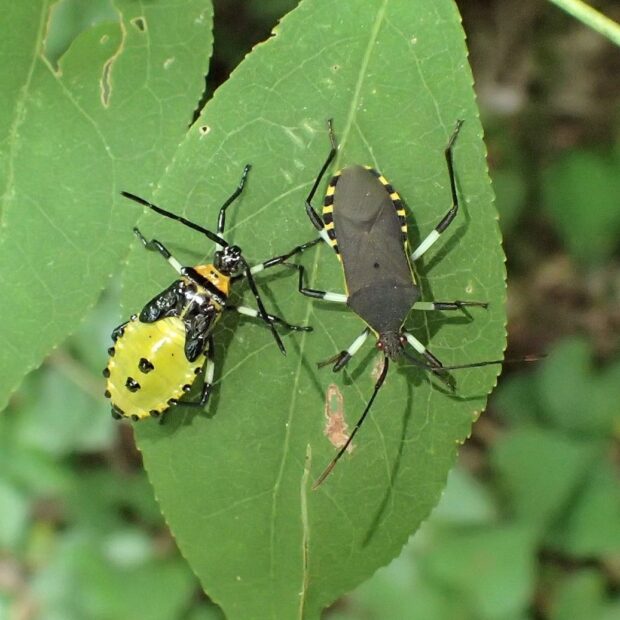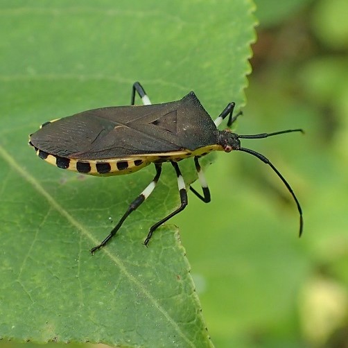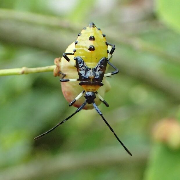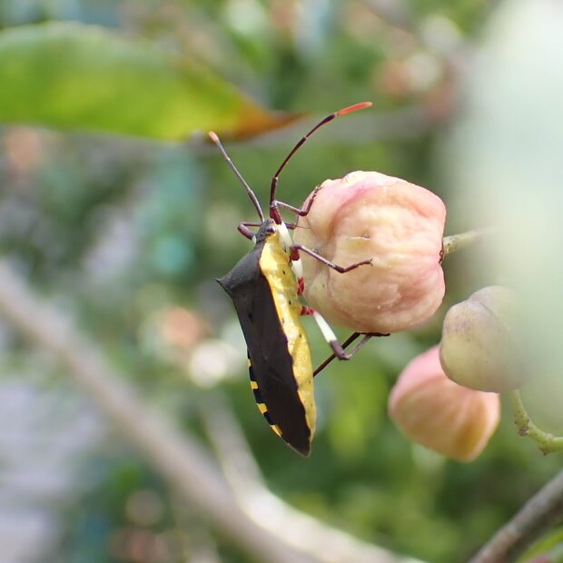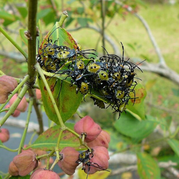 街中の庭や公園で見られるカメムシ。 マユミやニシキギなどの実に針のような口を突き刺し、 汁を吸います。 卵、 幼虫、 成虫が、 同じ木で見られることがあります。 このカメムシはそれほど臭くなく、 青リンゴの香りがするとか?