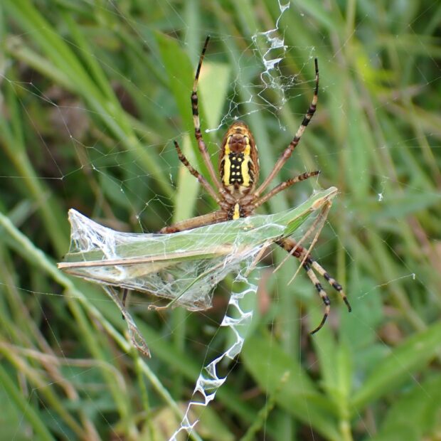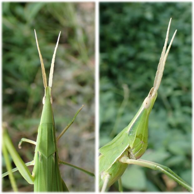 メスは大きくて迫力満点!草はらにすみ、 葉っぱと同じ緑色や茶色をしていますが、 たまにピンク色や黄色のものが見つかることがあります。 手で長い後ろあしをもつと、 体をすばやく上下に動かしおじぎをします。
