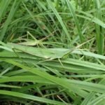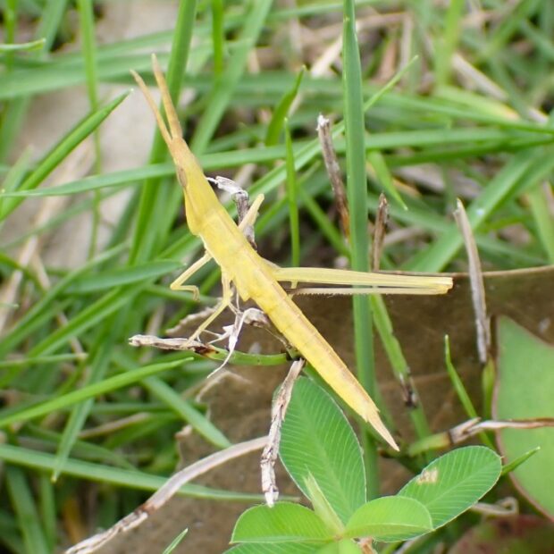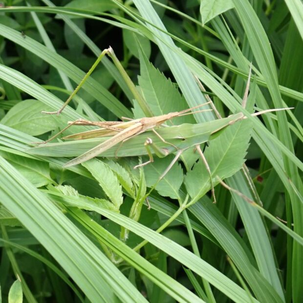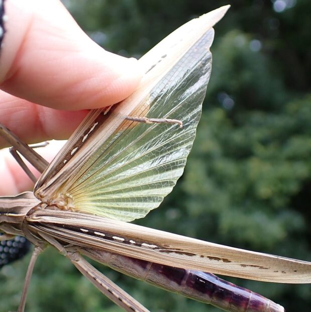 メスは大きくて迫力満点!草はらにすみ、 葉っぱと同じ緑色や茶色をしていますが、 たまにピンク色や黄色のものが見つかることがあります。 手で長い後ろあしをもつと、 体をすばやく上下に動かしおじぎをします。