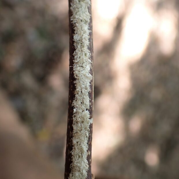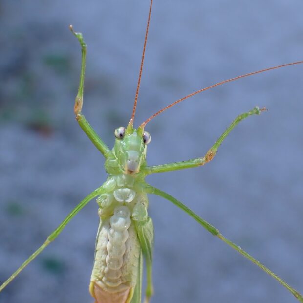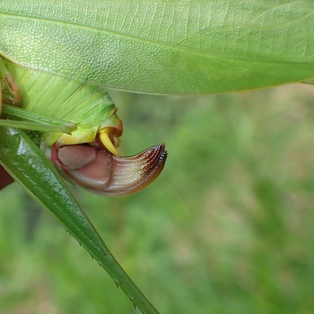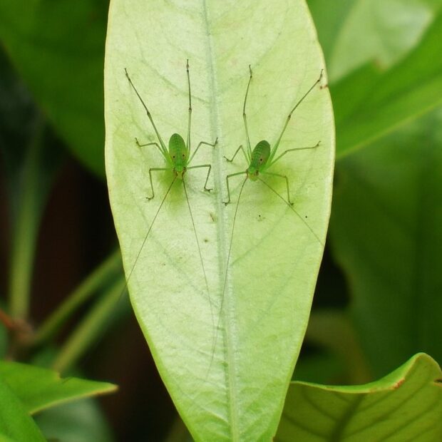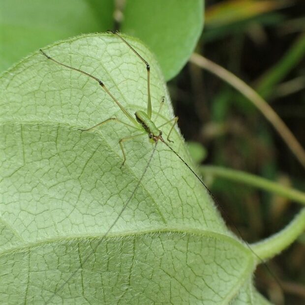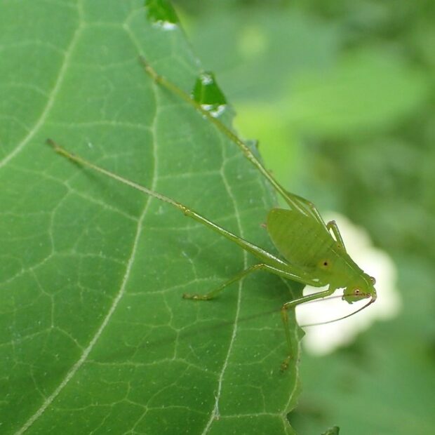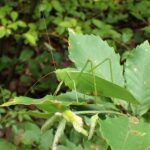 全身がきれいな緑色で、 はねが葉っぱのようにみえるツユムシの仲間。 木の上にすみ、 葉を食べ、 ヒラヒラとよく飛びます。 市街地の公園でも見られます。 メスは木の枝を裂いて、 卵を産みます。 (MT)