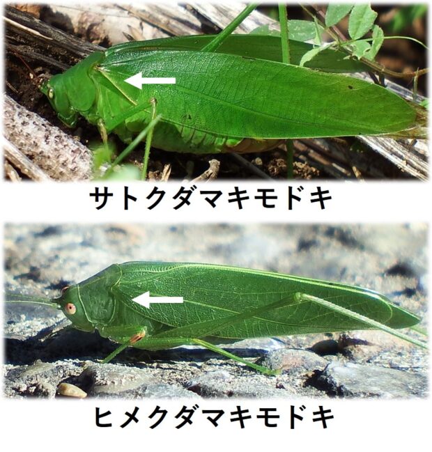サトクダマキモドキは一回り大きく、 メスの産卵管は褐色で幅があり短いです。 前ばねの前胸側の縁が黒と白で縁どられます。