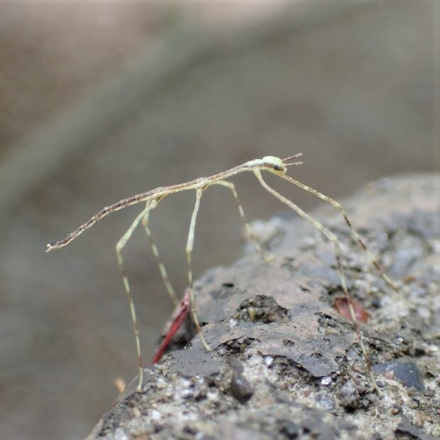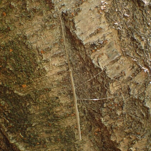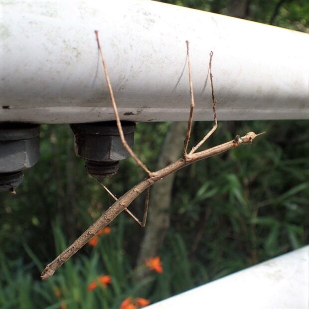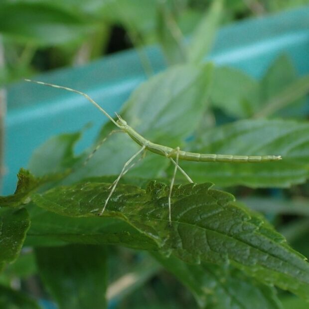 ナナフシの仲間で、 ナナフシモドキは触角が短いのが特徴。 緑色と褐色のものがおり、 はねがなく飛べません。 ゆっくり動き、 サクラやエノキなどの葉を食べるおとなしい虫です。 オスはめったに見つかりますせん。