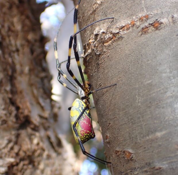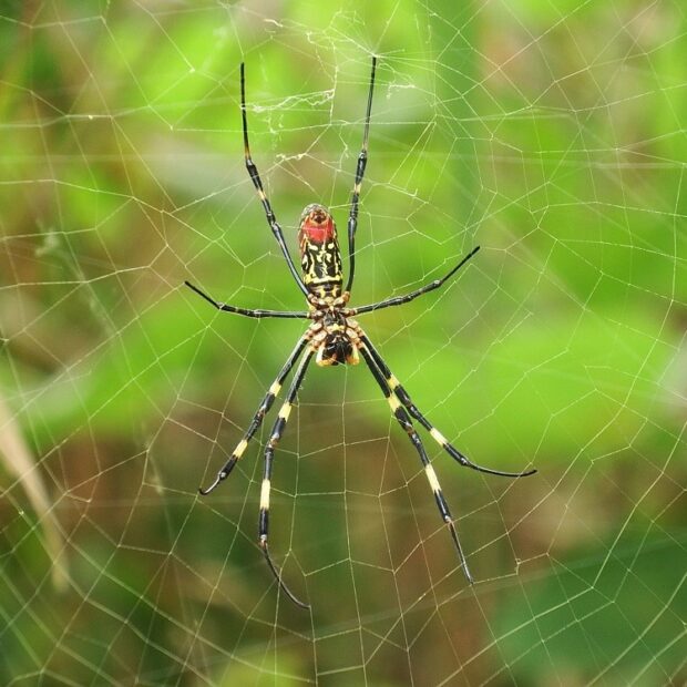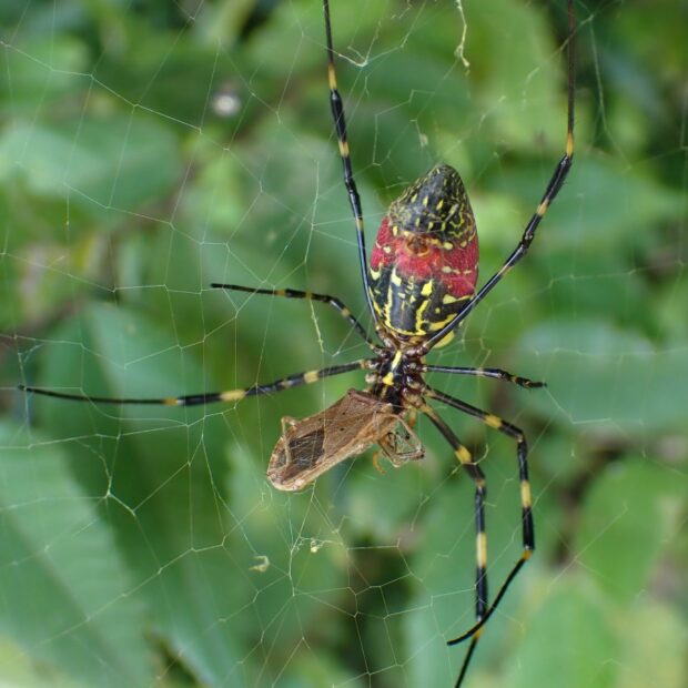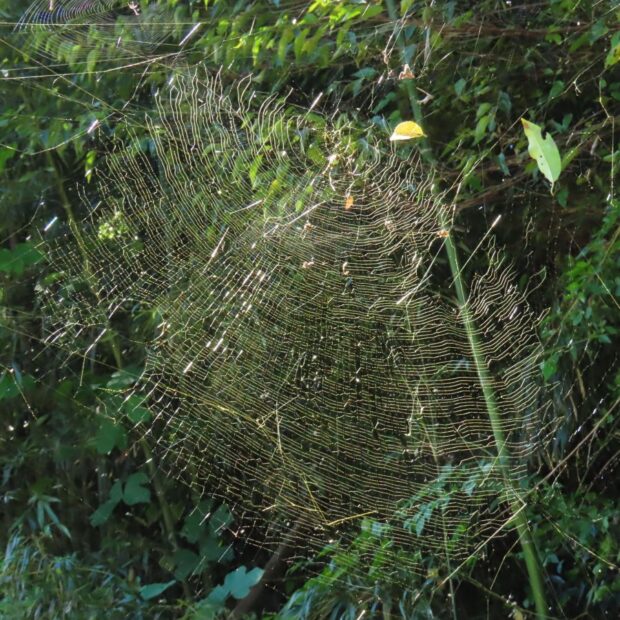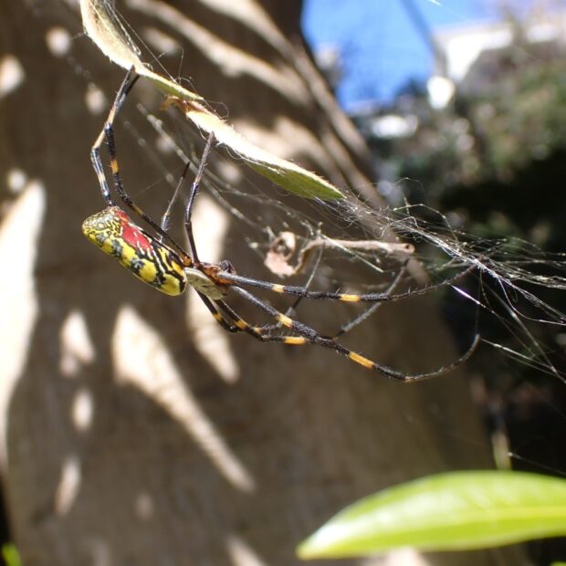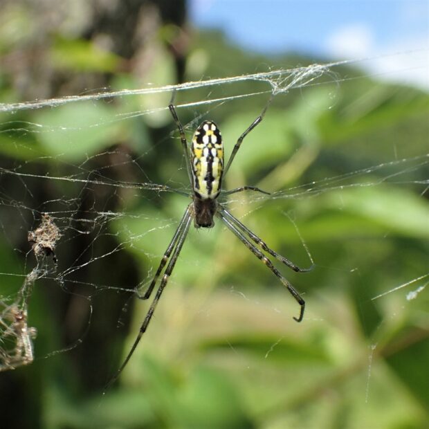 都市部から山地まで普通に見られるコガネグモの仲間。 秋になると大きな網になり、 うっかりしていると顔にクモの網がべったり。 光があたると金色に光ってみえます。 網は目の細かい馬蹄形で、 3重になっています。