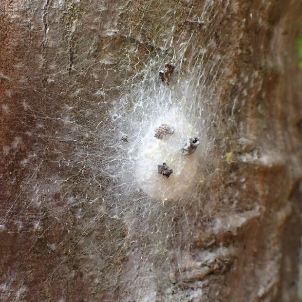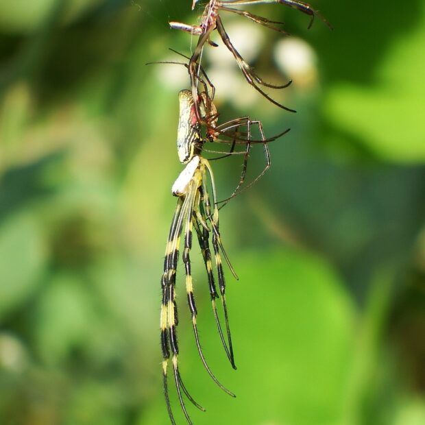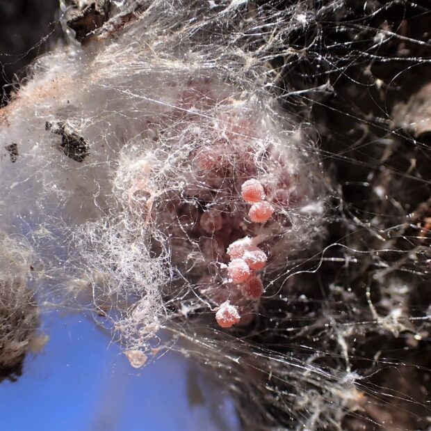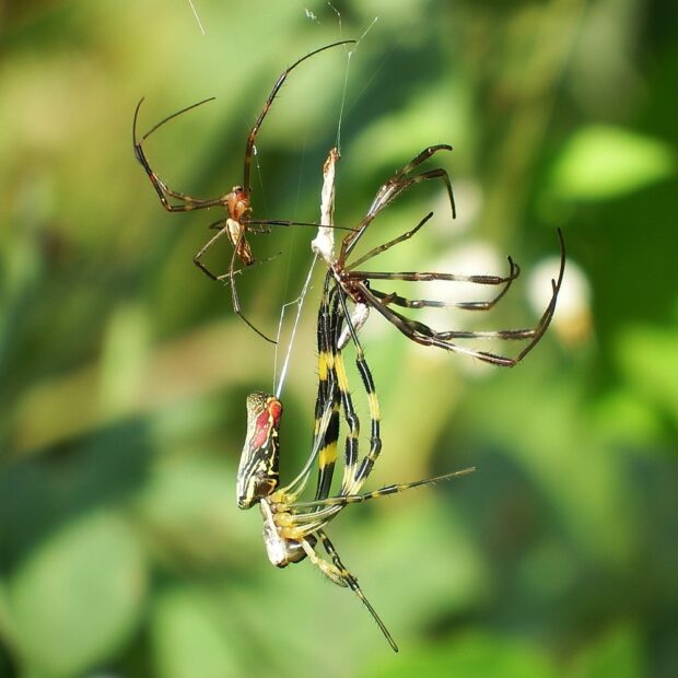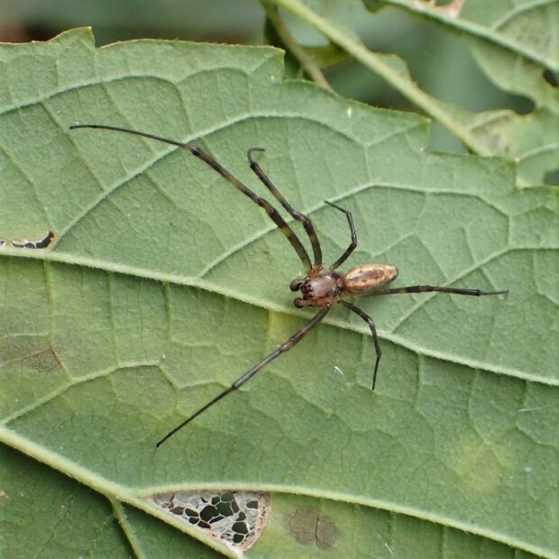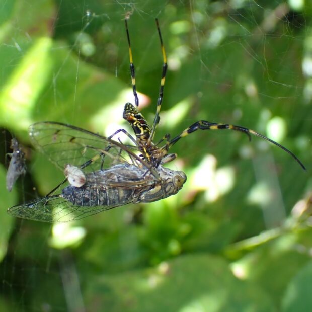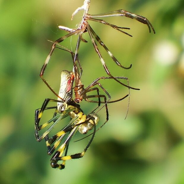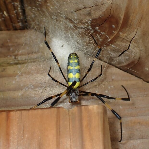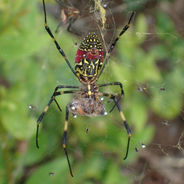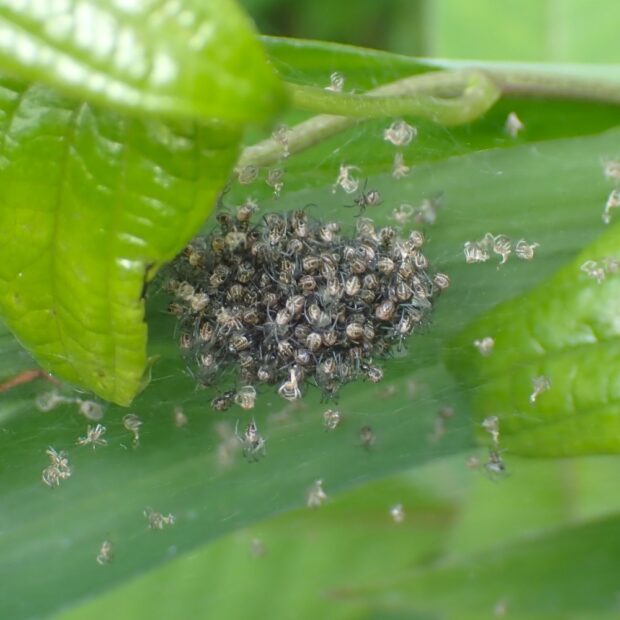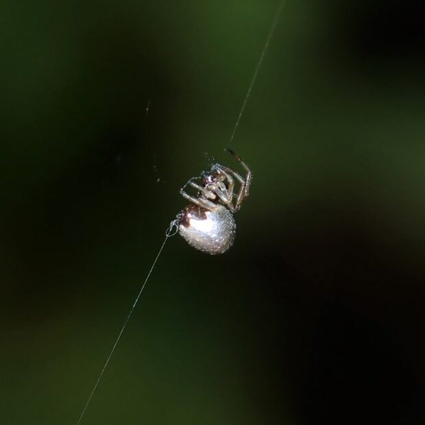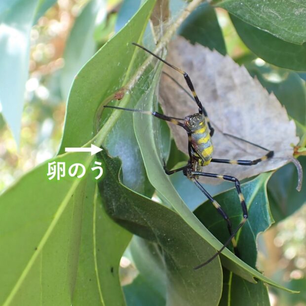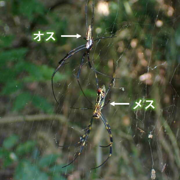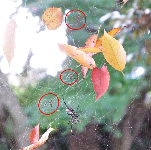 ジョロウグモの網に、 銀色に光る小さなクモが居候(いそうろう)していませんか。 シロカネイソウロウグモ(体長約3mm)と言い、 網にかかった小さな虫などを食べています。 他に、 いろいろな種類のクモがジョロウグモの大きな網に住み着いていることがあります。