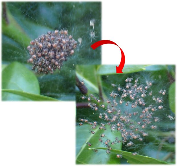 ジョロウグモの網に、 銀色に光る小さなクモが居候(いそうろう)していませんか。 シロカネイソウロウグモ(体長約3mm)と言い、 網にかかった小さな虫などを食べています。 他に、 いろいろな種類のクモがジョロウグモの大きな網に住み着いていることがあります。