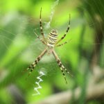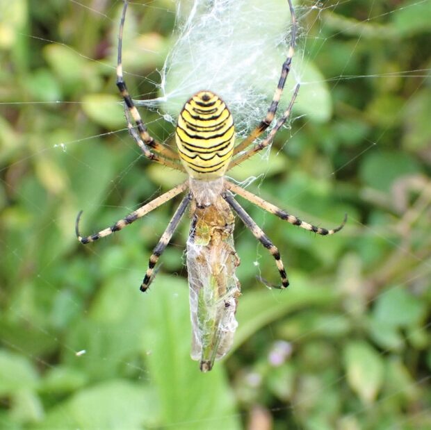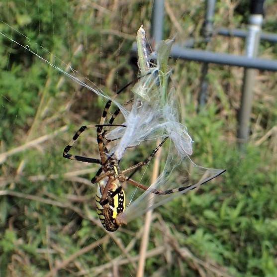 田んぼや明るい草地で見かけるコガネグモの仲間。 まるい網をはり、 網にはかくれ帯という白いギザギザしたものがついています。 かくれ帯は紫外線を反射し、 エサである虫を誘う他、 鳥などから網が破られるのを防ぐ役割もあるようです。