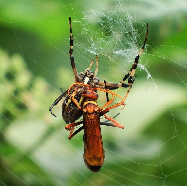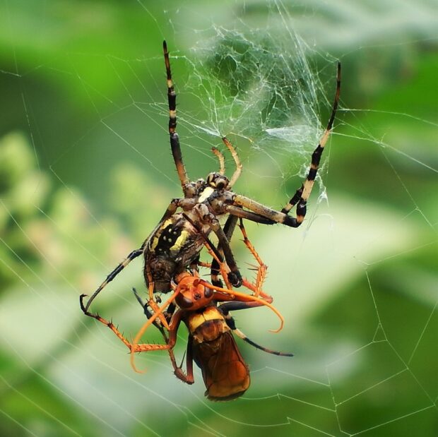 ナガコガネグモは、 カリバチの仲間のクモバチに襲われることがあります。 クモバチは、 子どものためにクモを狩るハチです。