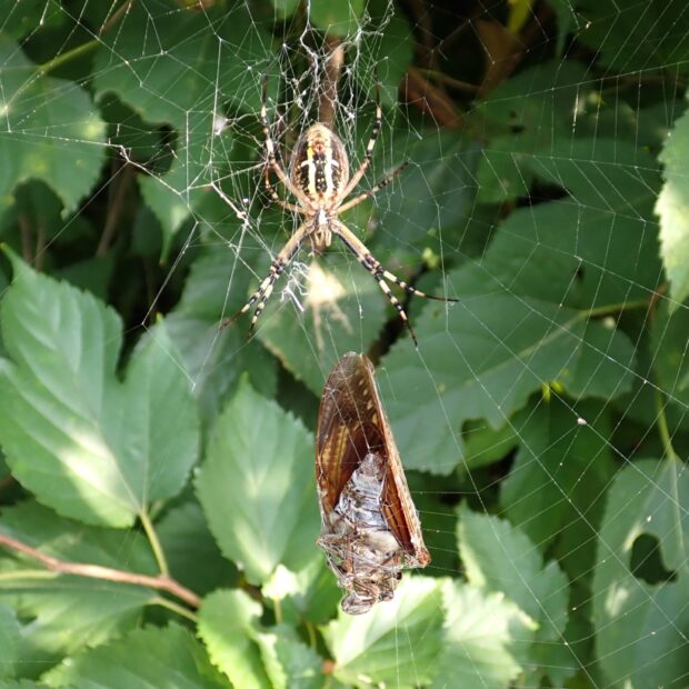 田んぼや明るい草地で見かけるコガネグモの仲間。 まるい網をはり、 網にはかくれ帯という白いギザギザしたものがついています。 かくれ帯は紫外線を反射し、 エサである虫を誘う他、 鳥などから網が破られるのを防ぐ役割もあるようです。