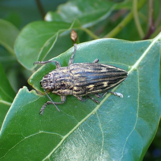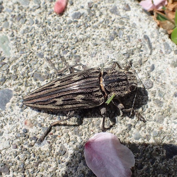 松林で見られる、 地味な色ながら美しいタマムシ。 タマムシの中では大型で、 縦に盛り上がった線があります。 幼虫は枯れたマツや切り株の中で、 3年ほどかけて育ちます。