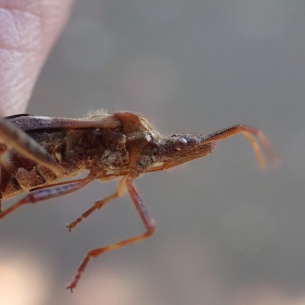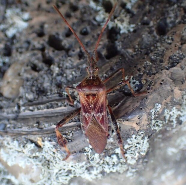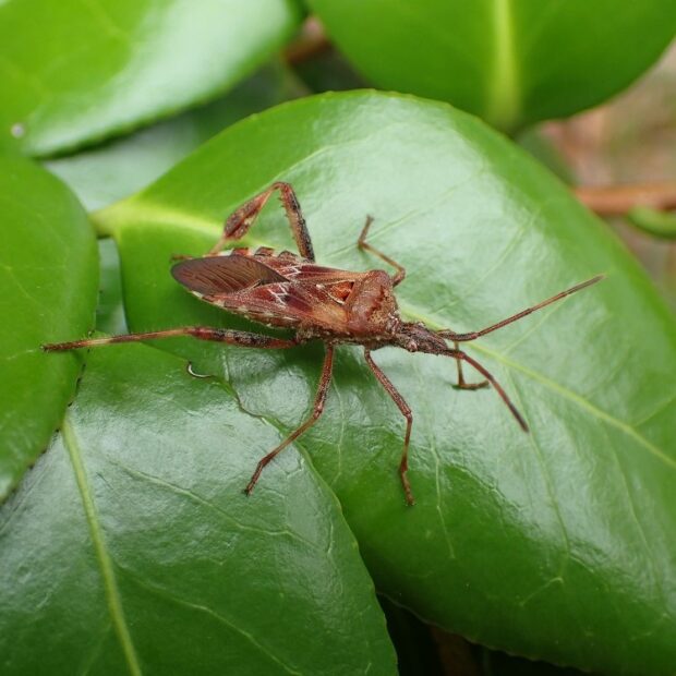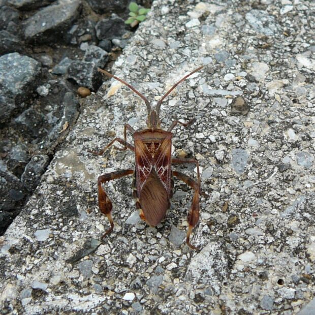 松で見られる北アメリカ原産のカメムシ。 2008年に東京で初めて見つかり、 分布を広げています。 はねは赤みがある茶褐色で複雑な模様があり、 後あしの脛節(けいせつ)に広がった部分があるのが特徴です。 (MT)