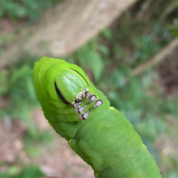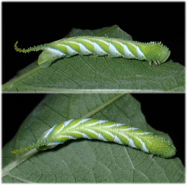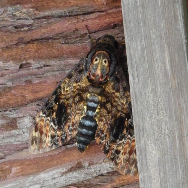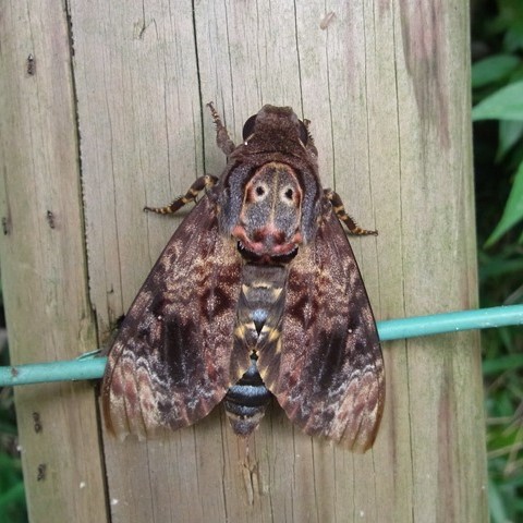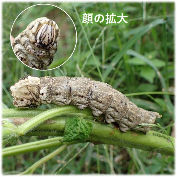 夏にあわられるスズメガ。 胸の模様が人の顔に見えることから「めんがた」という名前がつきました。 幼虫は大きく、 緑色、 黄色、 褐色のタイプがあります。 成虫はミツバチの巣を襲い、 蜜を盗む(蜜ドロボウ)ことが知られています。 九州以南で見られた南方系のガですが、 北上し、 本州各地で見られるようになりました。
