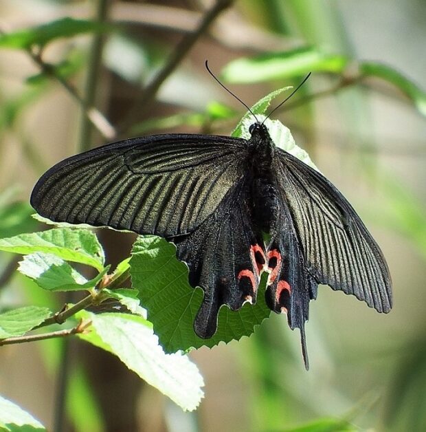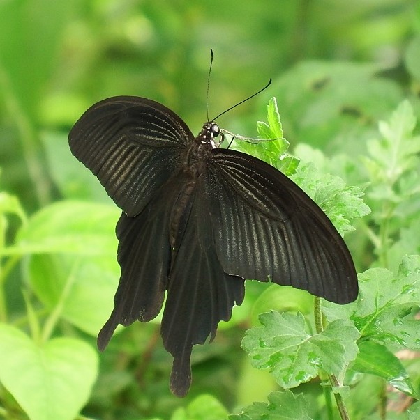 オナガアゲハは、 ほっそりしており尾状突起が長く、 腹部が黒いです。 山地、 渓流沿い、 雑木林の林縁で見られます。 オスは後ばね前縁に白い帯があります。