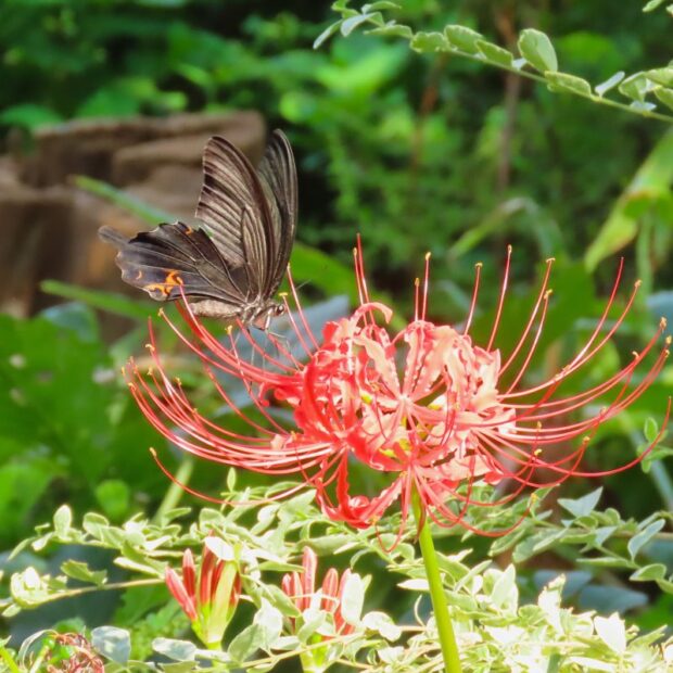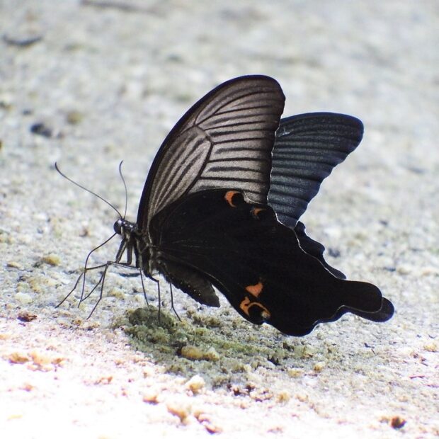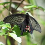 街中から山地まで、 もっとも普通に見られる黒いアゲハチョウ。 後ばねのしっぽのような尾状突起は短めで、 後ばねに赤い紋があります。 木の茂ったやや暗い林を好みます。