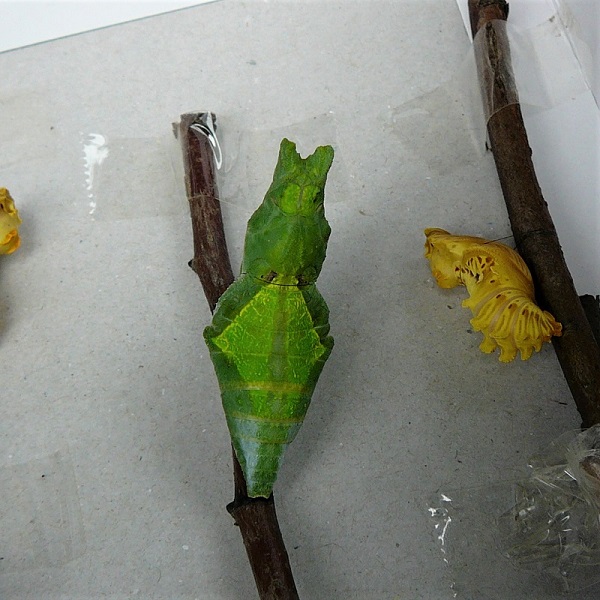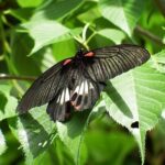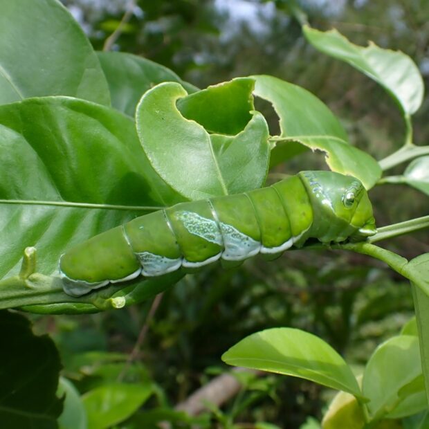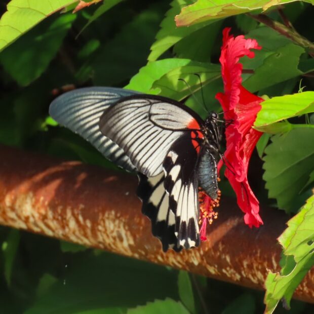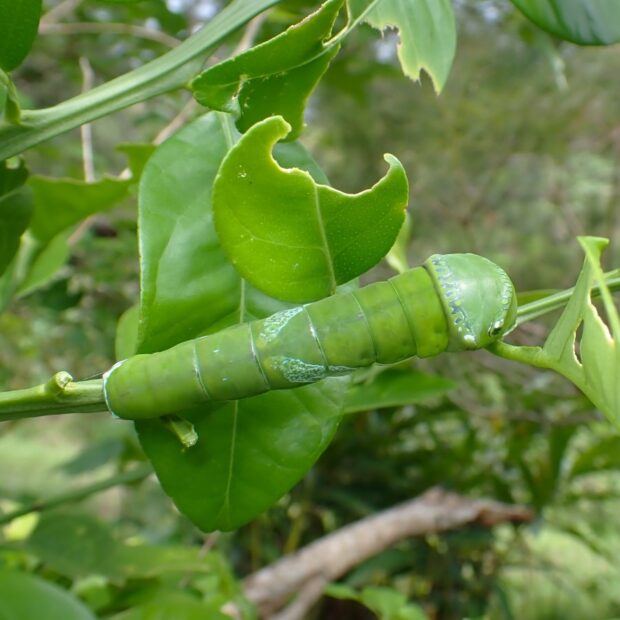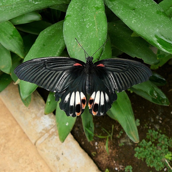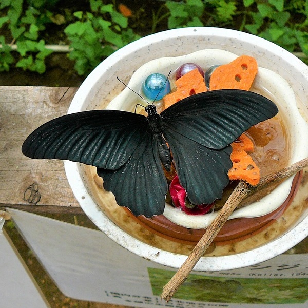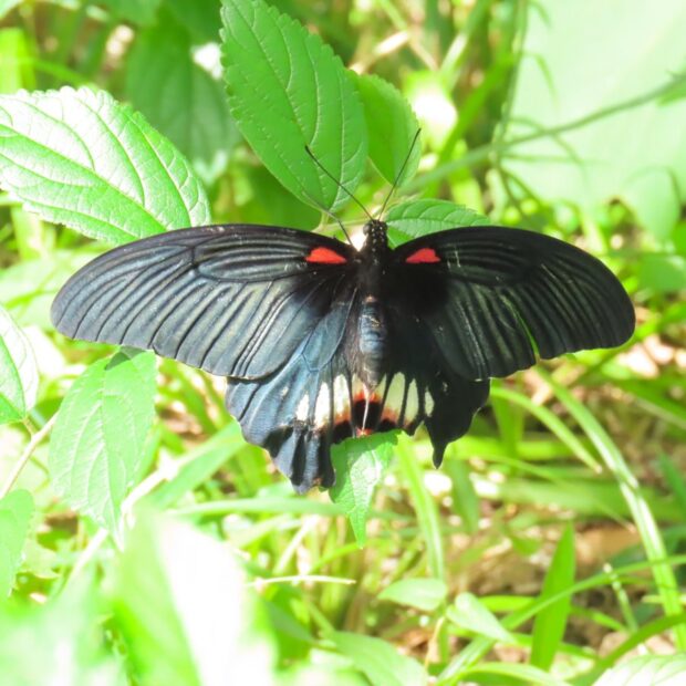 街中でも見られる黒い大きなアゲハチョウ。 オスとメスで色や模様が違い、 後ろばねにしっぽのような尾状突起がありません。 南方系のチョウですが、 分布を北へ広げており、 関東北部、 北陸地方まで進出しています。 幼虫は栽培ミカン類を好んで食べます。