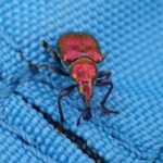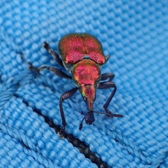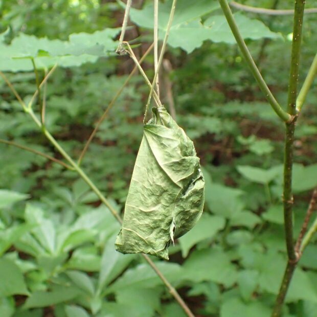 赤紫色に輝く、 大きなハマキチョッキリの仲間。 カエデ類の芽吹きと同時にあらわれます。 メスは、 5~6月、 カエデ類の若葉をたくさん巻いて揺籃(ようらん)を作り、 中に卵を産みます。 揺籃とはゆりかごのことで、 幼虫はこの中で葉を食べて育ちます。