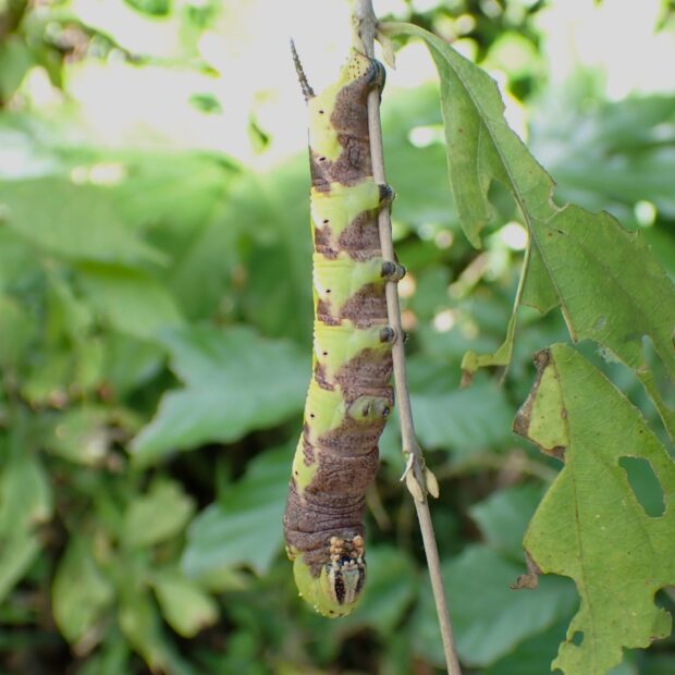 しもふり状の灰色のはねに黒い筋があるスズメガの仲間。 終齢幼虫は大きくて迫力があり、 9cmくらいになります。 幼虫は頭に近い部分と尾角(びかく)というしっぽのようなものに、 白いブツブツがあります。 土中で蛹越冬。