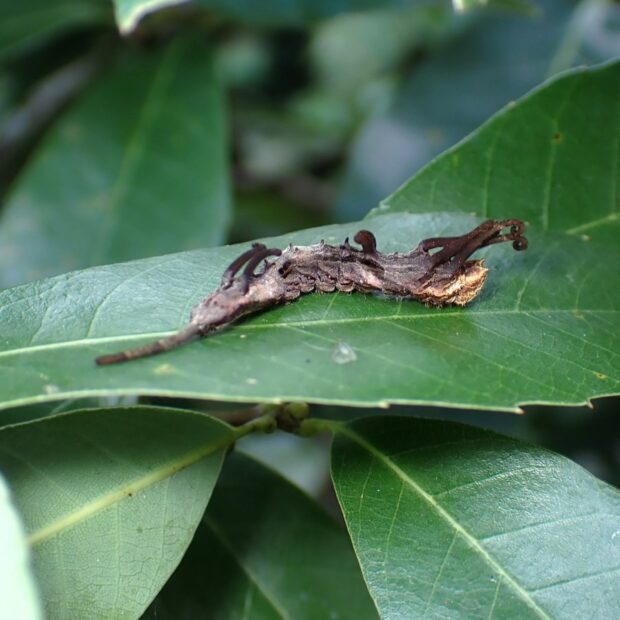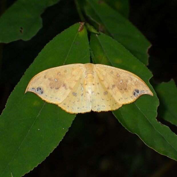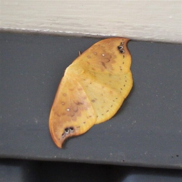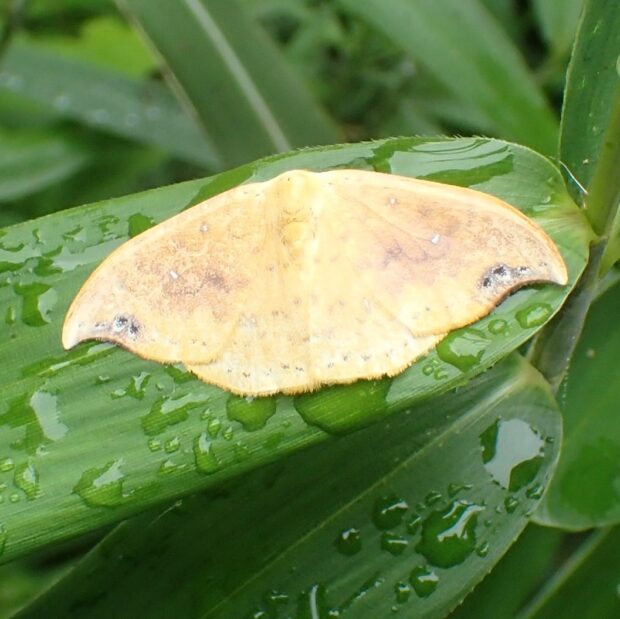 ウコン色(濃い黄色)をしたカギバガの仲間。 前ばねは先端が曲がり、 はねのふちに黒点があります。 幼虫は突起があり、 面白い姿をしています。