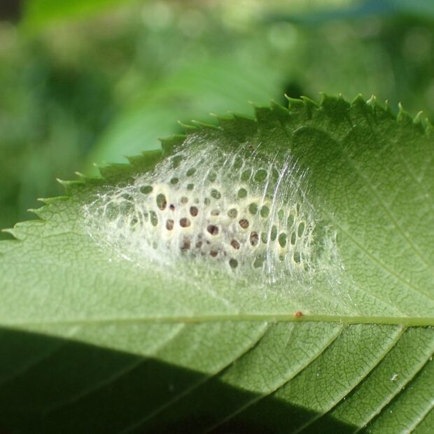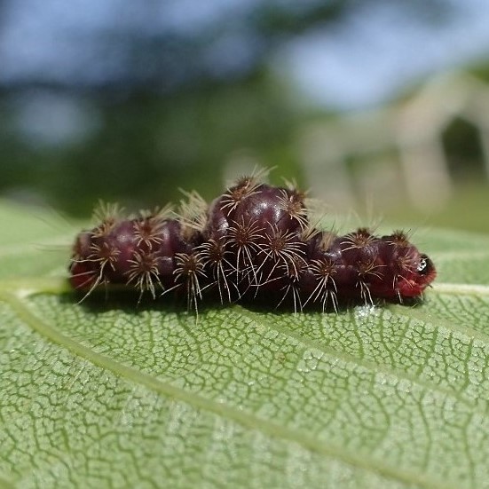幼虫は放射状に生えた白い毒針毛の束があり、 触れると皮膚が赤くはれ、 かゆくなります。 触らないでください!