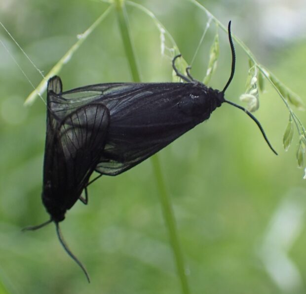 初夏にあらわれ、 昼間に飛ぶ小さなガ。 マダラガ科の仲間で、 梅の木やバラ科の植物で見られます。 はねは透明ですが、 黒っぽく見えます。 幼虫は赤っぽく、 毒の毛があるので注意!幼虫で冬を越します。 (MT)