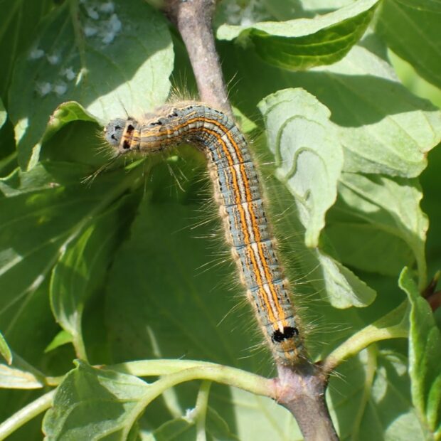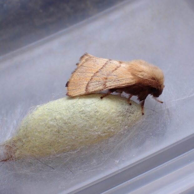 カレハガの仲間。 幼虫は、 テンマクケムシ(天幕毛虫)あるいはウメケムシと呼ばれます。 ウメやサクラの枝に、 糸でテントのように大きな幕をはって群がります。 幼虫が大きくなると分散し、 単独で行動します。 幼虫に毒はありません。