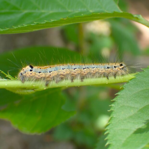 カレハガの仲間。 幼虫は、 テンマクケムシ(天幕毛虫)あるいはウメケムシと呼ばれます。 ウメやサクラの枝に、 糸でテントのように大きな幕をはって群がります。 幼虫が大きくなると分散し、 単独で行動します。 幼虫に毒はありません。 (MT)