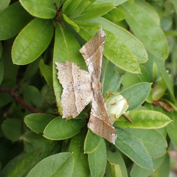 前ばねの先端が白く、 はねが角ばっているエダシャクの仲間。 「つま」とは先端の部分のことで、 ツマジロとは先端が白いということです。 前ばねと後ばねを離してとまります。