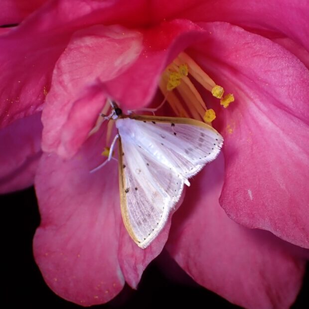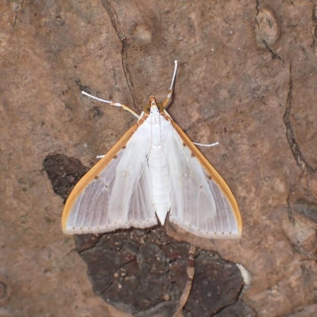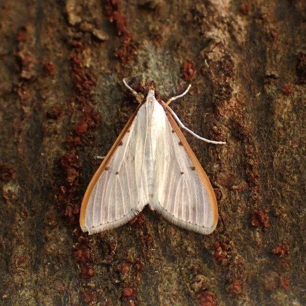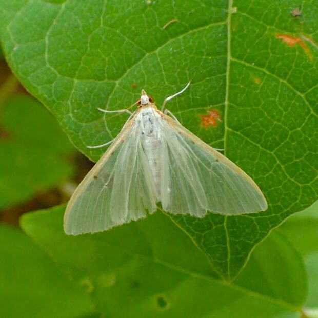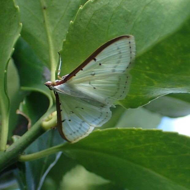 ツトガの仲間。 半透明の白いはねをもち、 前ばねのふちには赤褐色の筋があります。 人家周辺で見られる小さなガで、 キンモクセイなどの庭木にもやってきます。