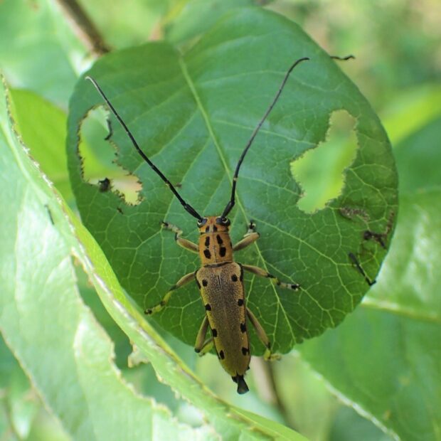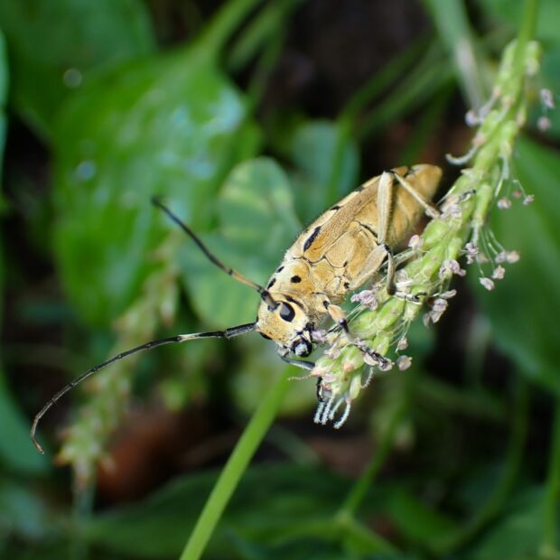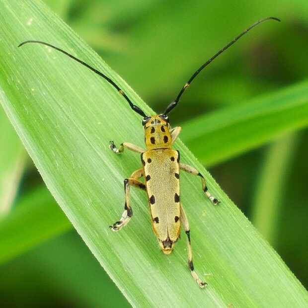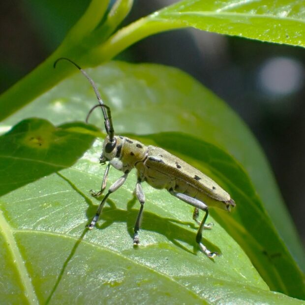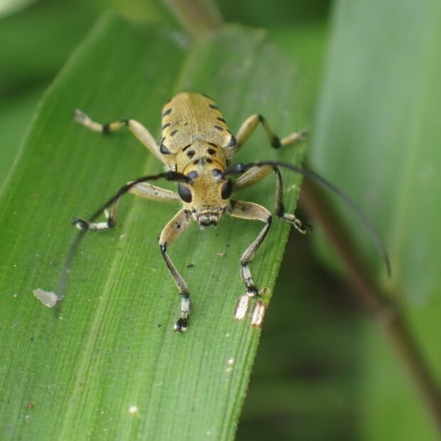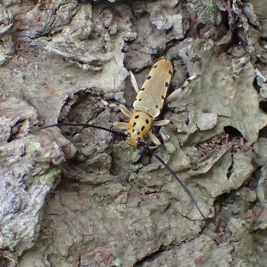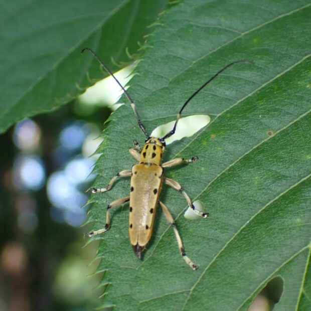 平地~山地に広く生息し、 サクラ類などで普通に見られるカミキリムシ。 はねに8つの黒点があることから「やつめ」と名づけられました。 前胸にも黒点があり規則正しく並んでいます。 微毛におおわれて、 この毛の色が異なることで、 黄色から淡い黄緑色まで色の違いが見られます。
