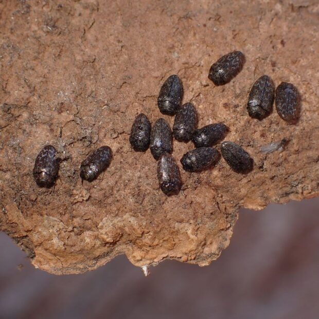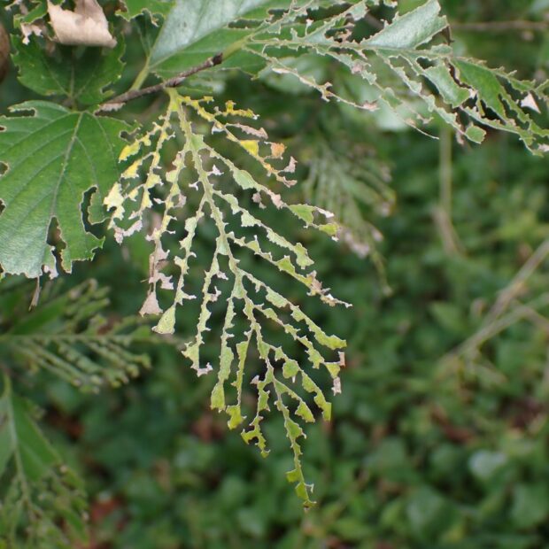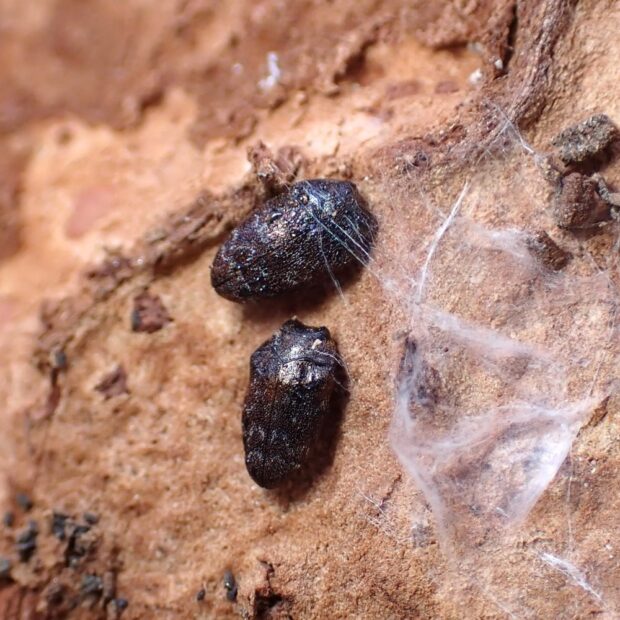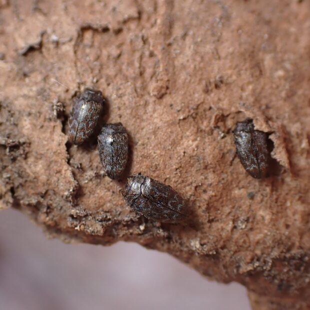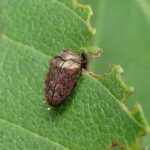 白っぽい波型模様があるチビタマムシ。 幼虫はケヤキの葉の内部を食べて成長し、 葉の中で蛹になります。 ケヤキにヤノナミガタチビタマムシが沢山あらわれると、 初夏に葉が茶色くなり、 葉が落ちてしまうことがあります。