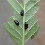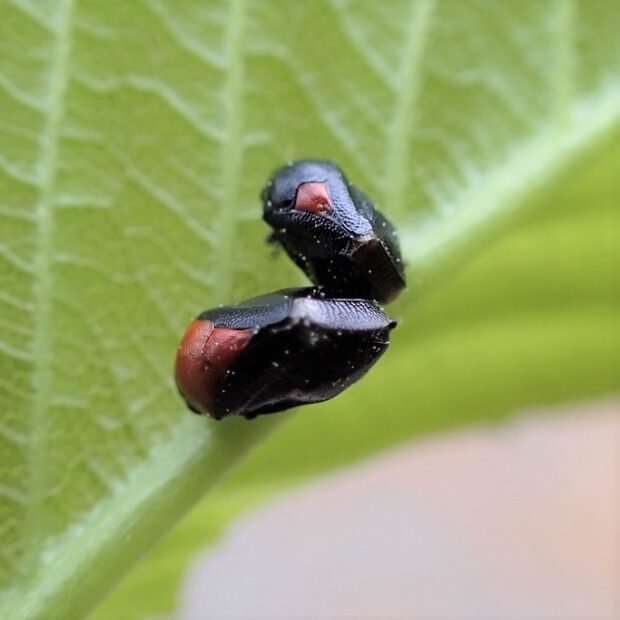 黒色で胸が赤い光沢のあるトゲアワフキの一種。 サクラの葉の汁を吸うカメムシの仲間になります。 幼虫は石灰質を分泌し、 枝に巻貝のような巣を作り、 その中で育ちます。 (MT)