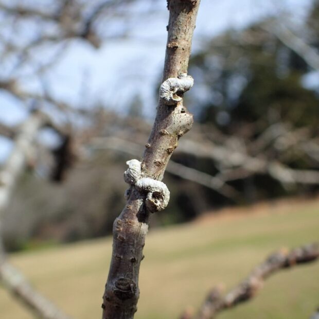 • 巻貝のような幼虫の巣は、 枝に長くついている。