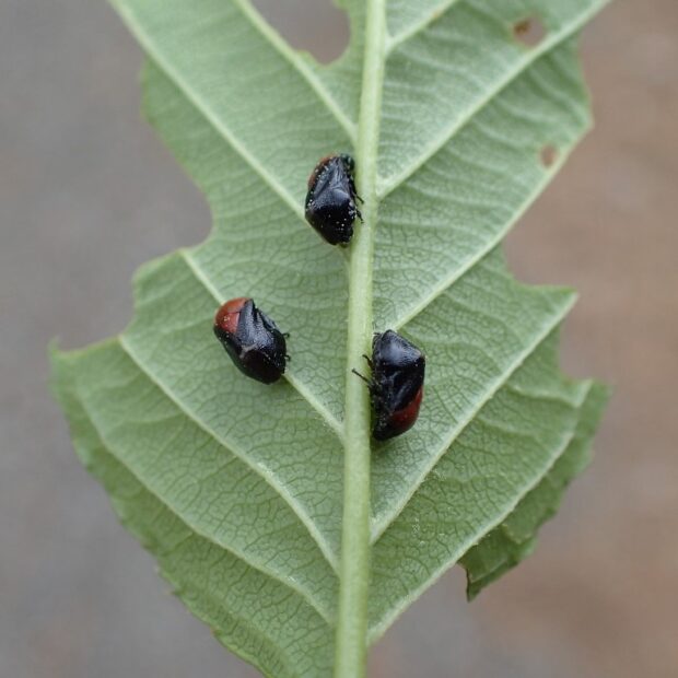 • 成虫はサクラの葉の葉脈(すじのところ)にいる。