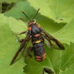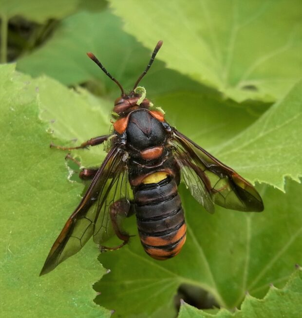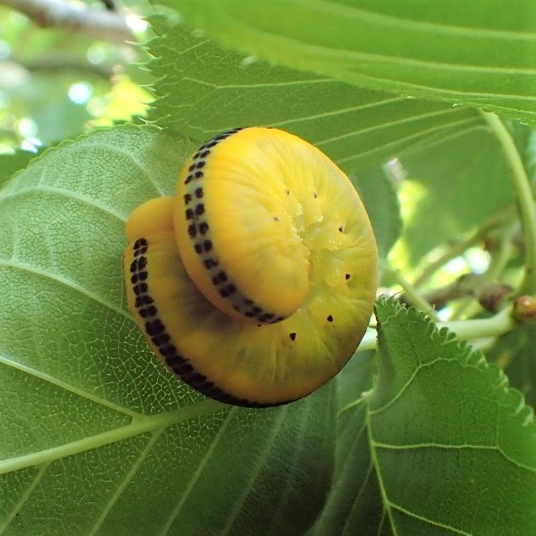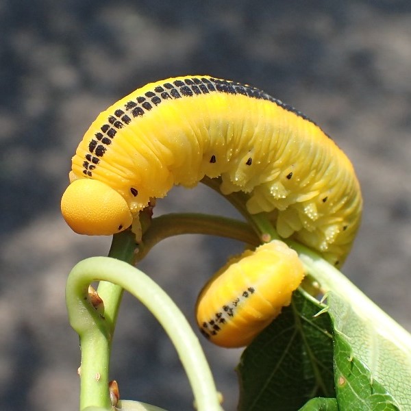 ハバチは幼虫が葉を食べるハチです。 ナシアシブトハバチはスズメバチに似ていますが、 人を刺すことはありません。 メスは、 春、 サクラなどの葉の中に卵を産みつけます。 幼虫は黄色でとても目立ちます。 (MT)
